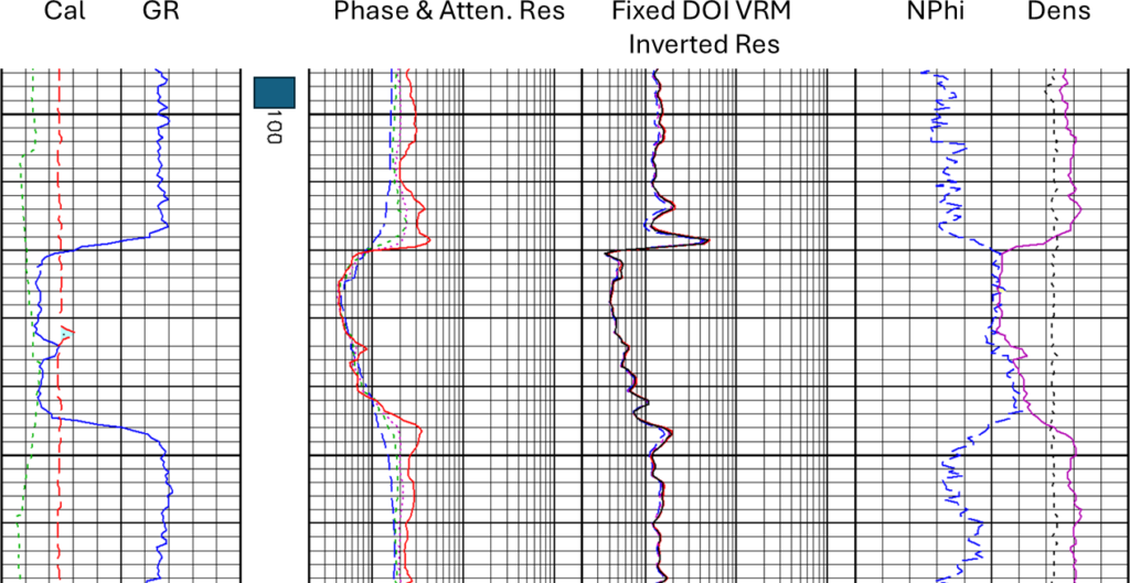 Let’s have a look at the original triple-combo log (Figure 2) that shows not just the inverted resistivity curves but also the original phase and attenuation curves.