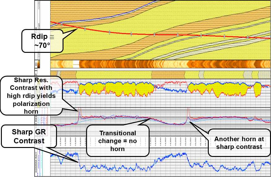 Literally in this case the devil is in the details! In hydrocarbon zones with both sharp top and sharp base, the polarization horns can even look like devil horns. The worse devil though is falsely thinking hydrocarbons as in the Lundi Log example! Sidetrack or offset updip to catch “full pay” may well yield the same horn effect!