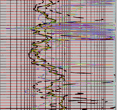 This bit of looneyness during a massive redo of the client’s log database. Basically we found so many problems with the earlier digital database (misassigned  APIs, incomplete log header, incomplete scales [e.g., simply NPHI without apparent matrix unit]) that the client wanted our group to redigitize all of the well logs in the field area. After digitization as part of the QC process we overlaid the new LAS digits onto the raster image and ended up with this garbage. Normally, the generation of the LAS digits was effectively instantaneous (<1 sec) but every now and then it took 2–3 sec, a notable pause and the LAS overlay would show this gobblygook. We found that this error correlated with logs that had “stretches” in the log scan where the scanner infeed struggled with the log folds. The software allowed correction of the measured depth lines but apparently a software bug was triggered when this situation occurred. Oddly the LAS digit issue did not arise at the point of the log stretch but rather randomly elsewhere in the log. We resolved the issue on our end by placing a CD case on top of the log while scanning to push it down better for the scanner infeed. We also advised the company of the bug, which was subsequently corrected. They also added a flap mechanism to weight down the log on their actual scanner. I wonder how many old digital logs encountered this same problem but was not identified. We used version 5.0/5.1 of the software so a lot of LAS files had been generated for years prior without identifying the bug. You’ve got to QC the logs and a great way is to overlay the digits back onto the raster scan. This was a good example of good data in but garbage out!