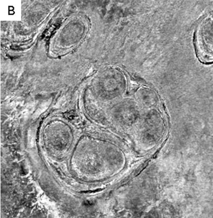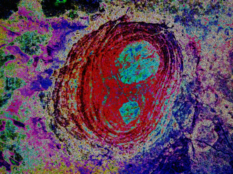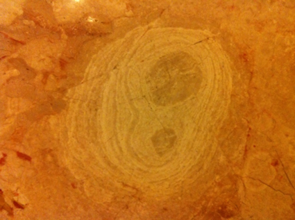 Figure 2. Original photograph and color manipulated image of small-scale carbonate buildup observed in bathroom tile, Parkroyal Hotel, Kuala Lumpur, Malaysia. 20 cm x 10 cm.